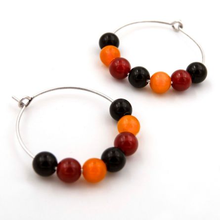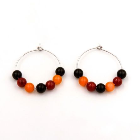 Pendientes artesanales con piedras naturales (ágata roja, aventurina amarilla y cuarzo negro), aro de zamak con baño en plata.