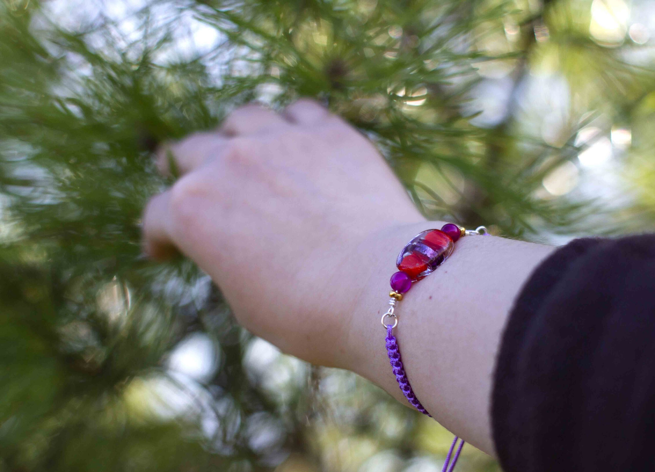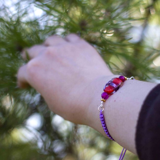 Pulsera artesanal con cuenta de cristal artesanal de color naranja y violeta, adornado con piedras de ágata rosa y cuentas de metal, pulsera de macrame trenzado acabado en nudo ajustable para diferentes tallas de muñeca.