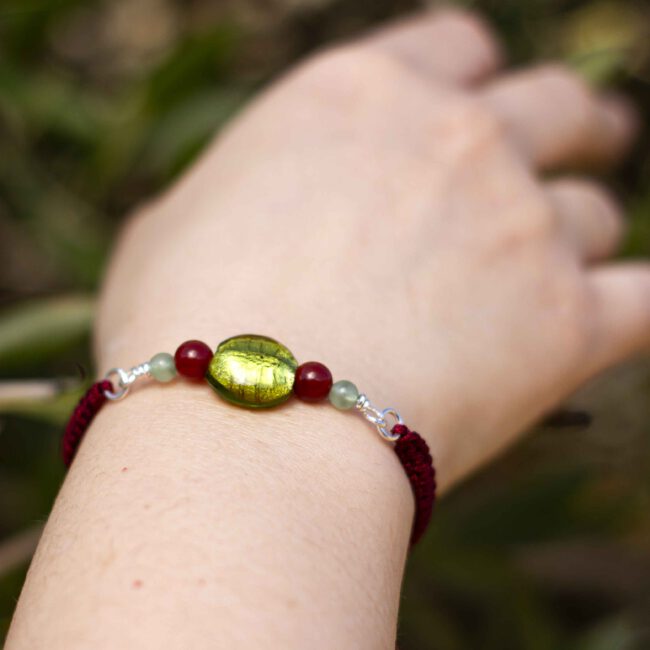 Pulsera artesanal con cuenta de cristal artesanal de color verde plateado, adornado con piedras naturales de ágatas rojas y aventurinas verdes, pulsera de macrame trenzado acabado en nudo ajustable para diferentes tallas de muñeca.