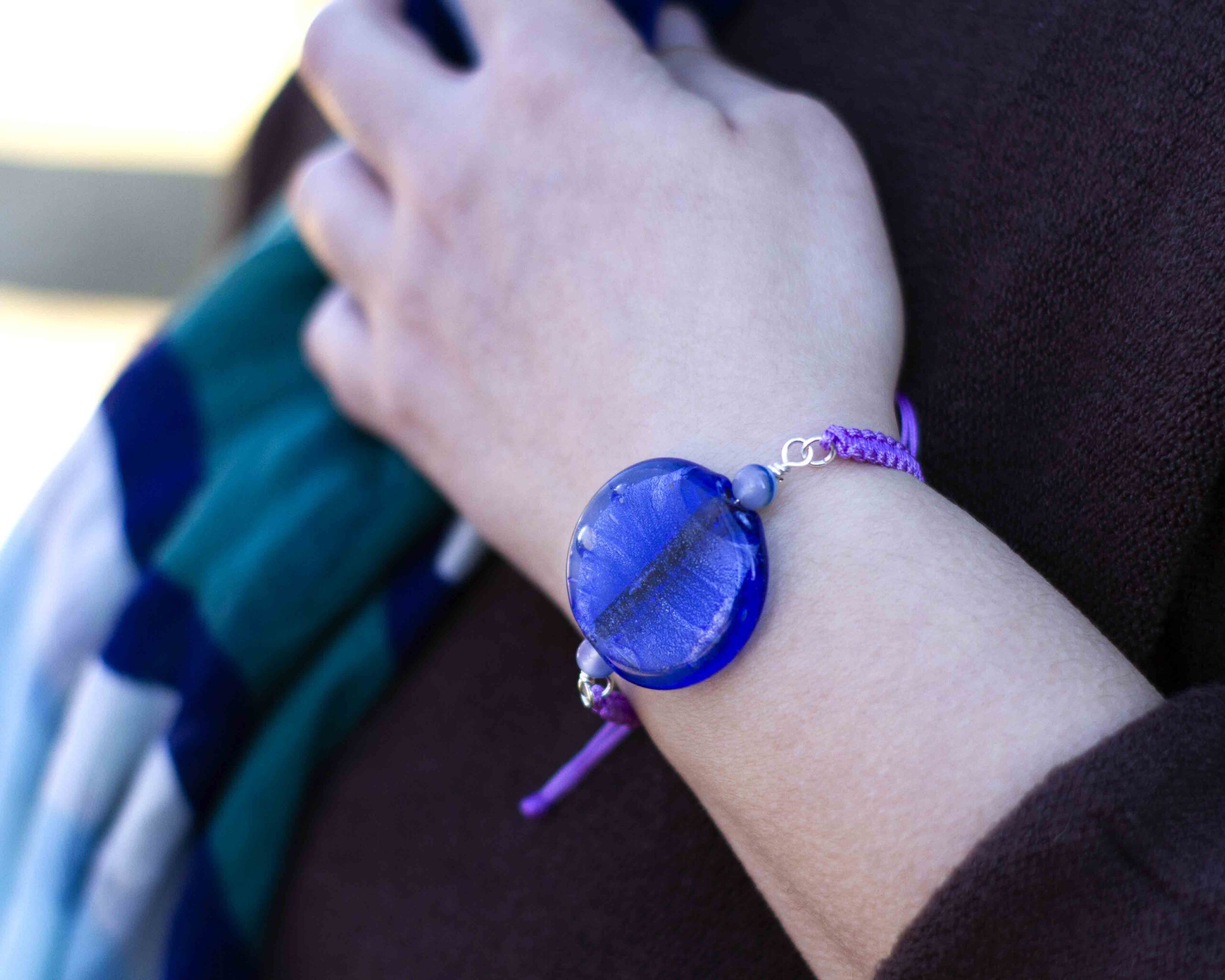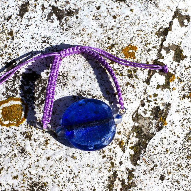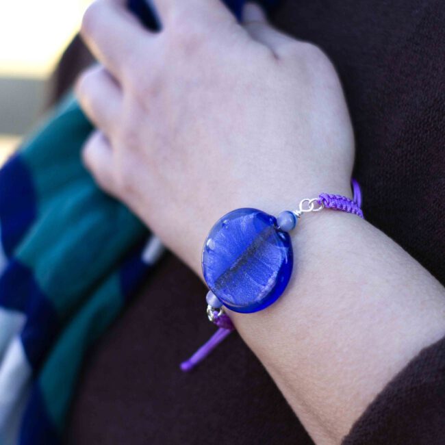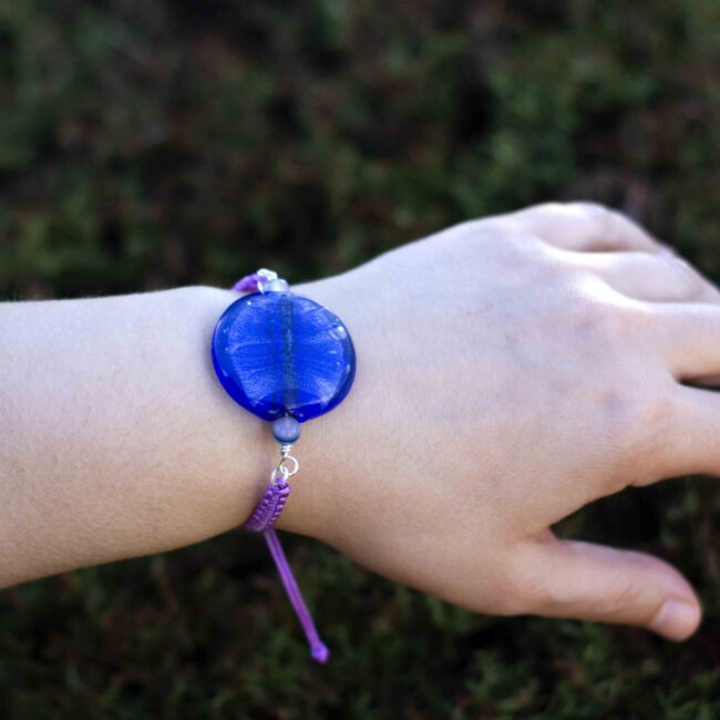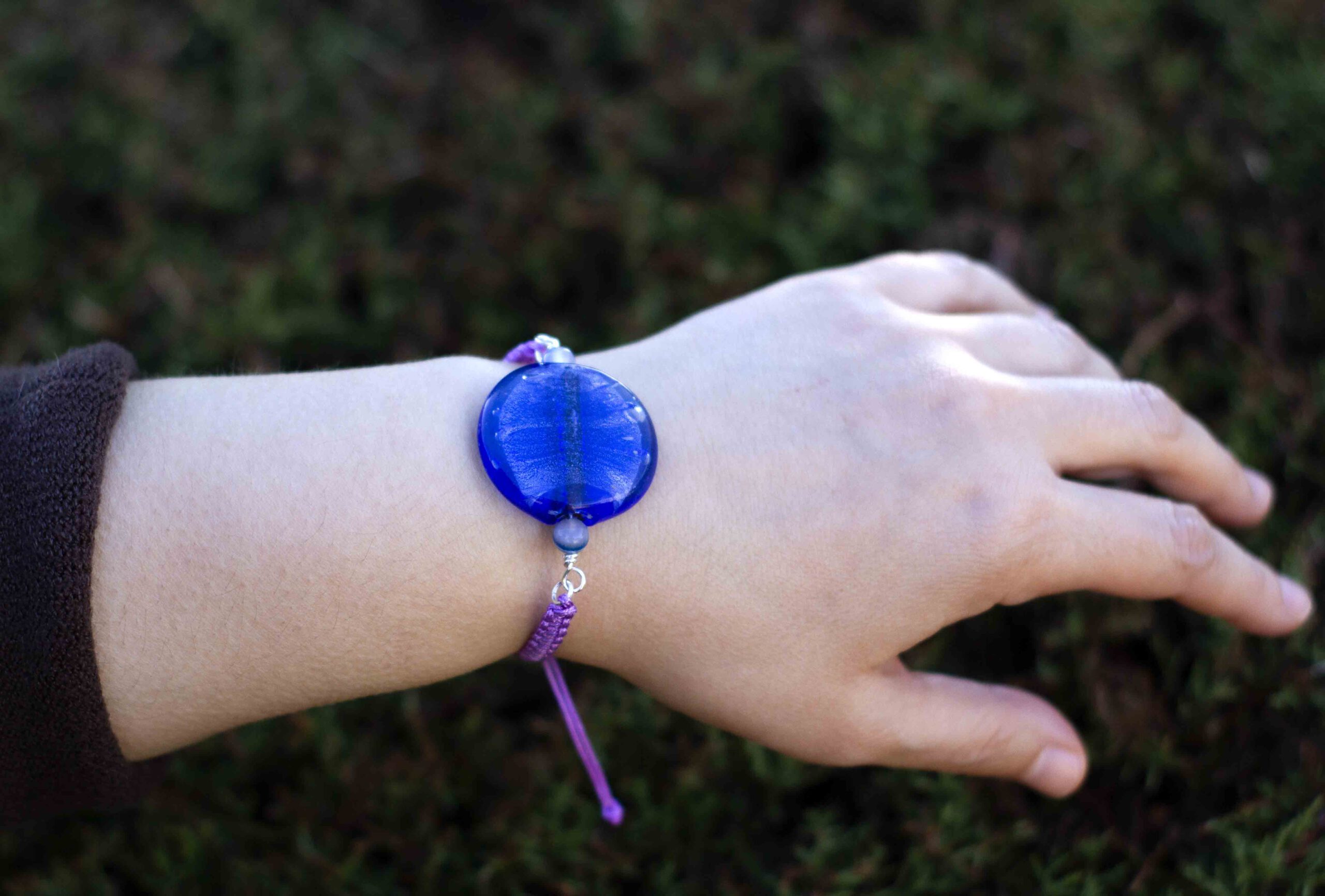 Pulsera artesanal con cuenta de cristal artesanal de color azul intenso, adornado con piedras de ágata azul, pulsera de macrame trenzado acabado en nudo ajustable para diferentes tallas de muñeca.