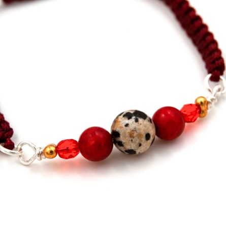 Pulsera artesanal con piedras naturales (jaspe dálmata y coral rojo), adornado no cristales checos rojos y cuentas de metal, pulsera de macrame trenzado acabado en nudo ajustable para diferentes tallas de muñeca.