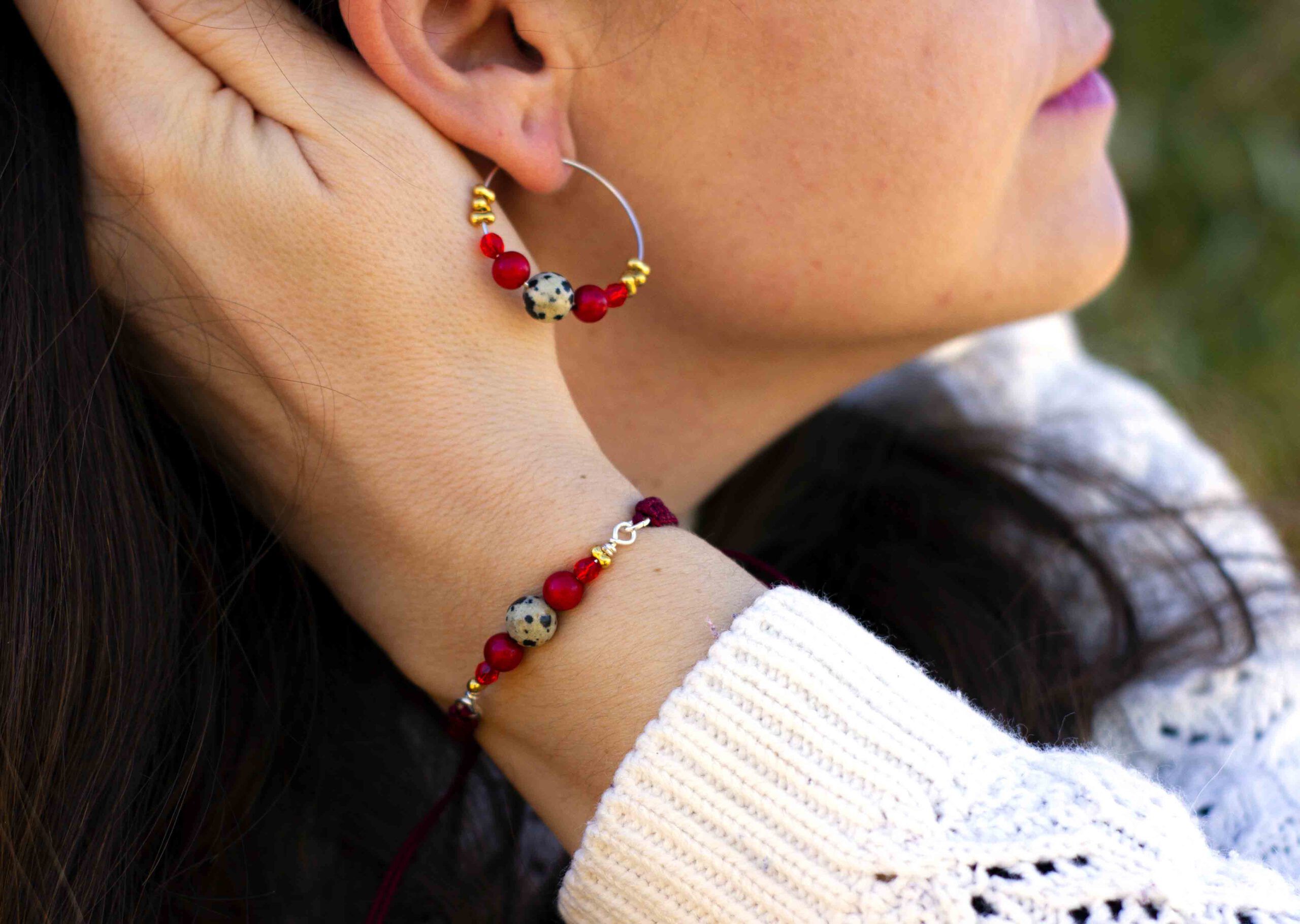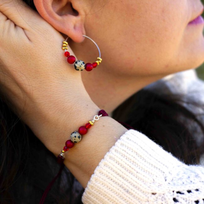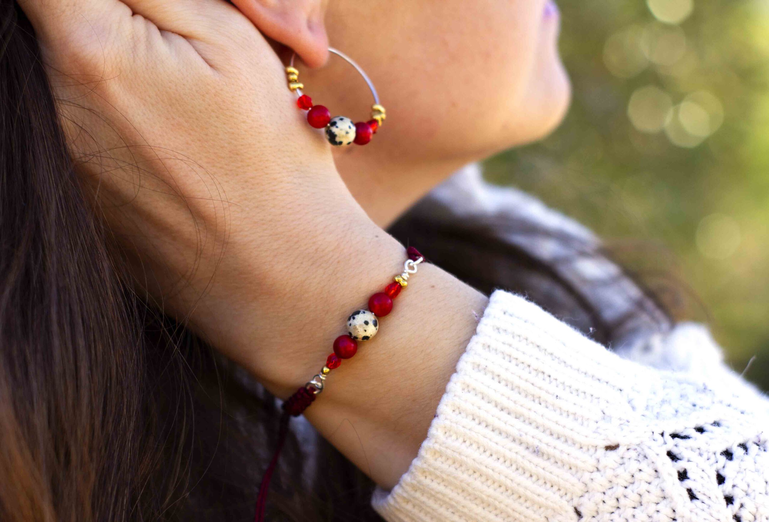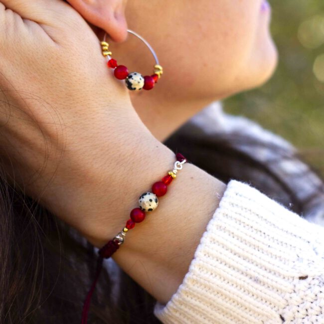 Esta pulsera une Jaspe dálmata que aporta equilibrio y coral rojo que enciende la vitalidad: una pulsera que hace florecer la alegría.”