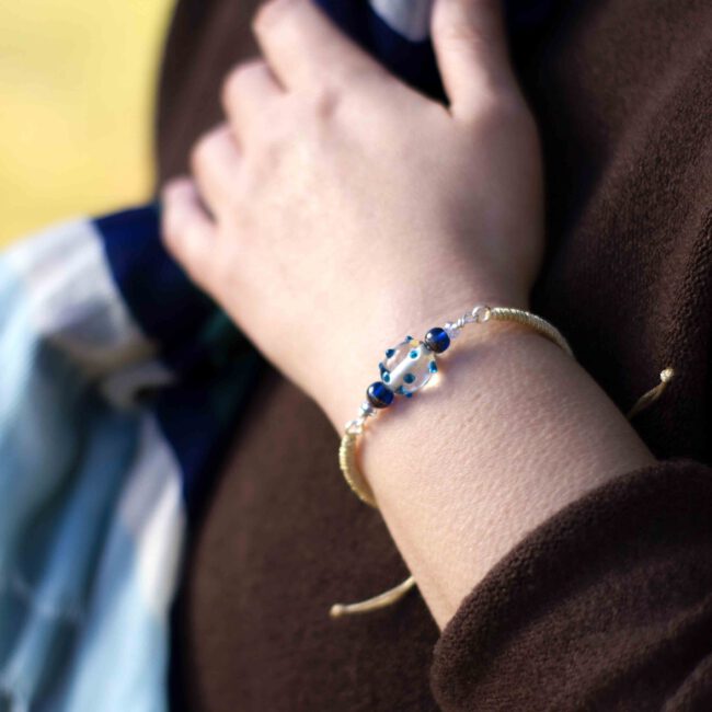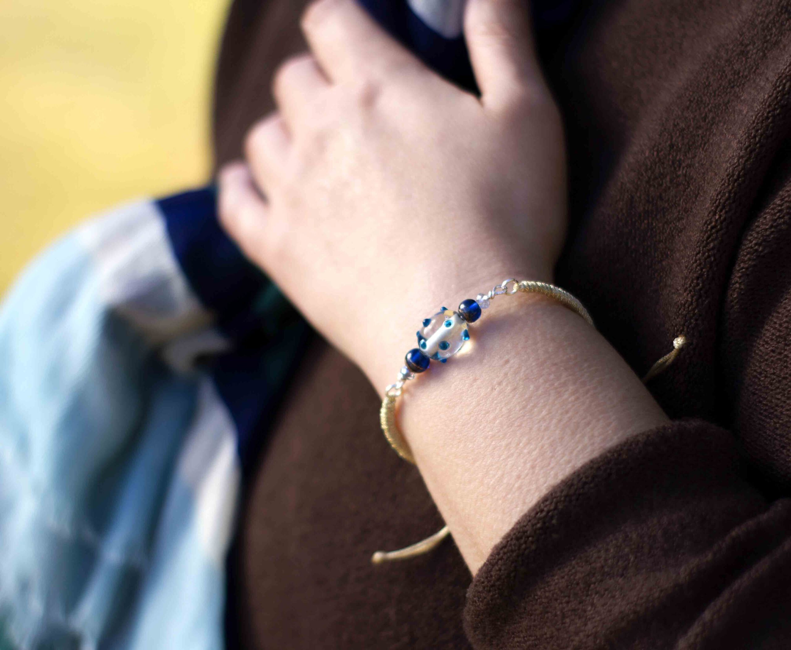 Pulsera artesanal con cuenta de cristal artesanal transparente con lunares en relieve de color azul, adornado con cristales artesanales azules y dorados, cristales checos plateados, pulsera de macrame trenzado acabado en nudo ajustable para diferentes tallas de muñeca.