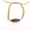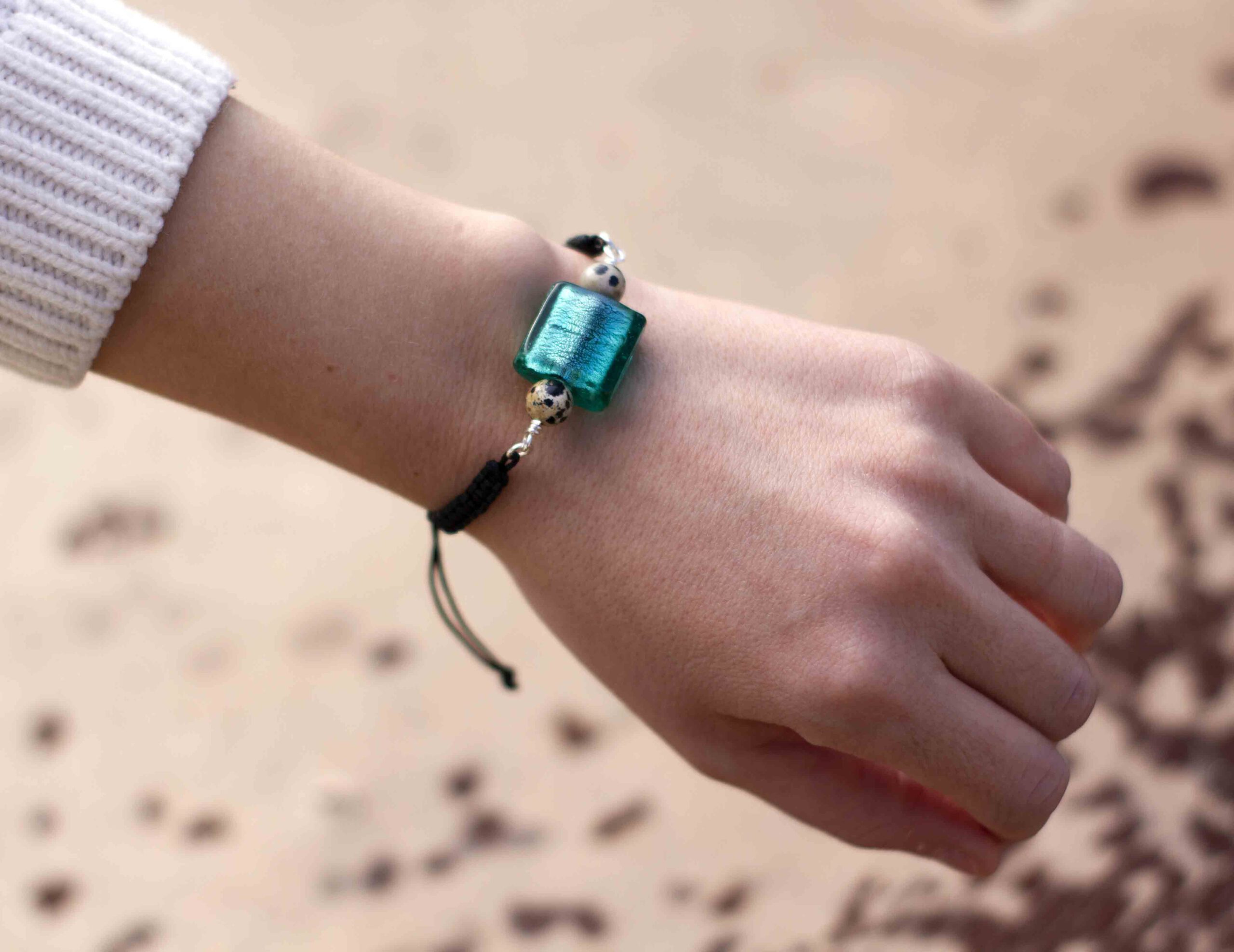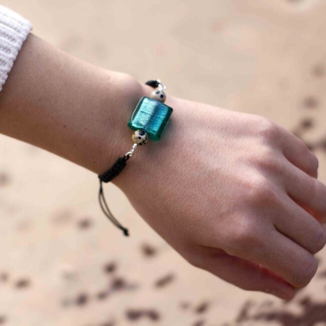 Pulsera artesanal con cuenta de cristal artesanal de color azul, adornado con piedras de jaspe dálmata, pulsera de macrame trenzado acabado en nudo ajustable para diferentes tallas de muñeca.