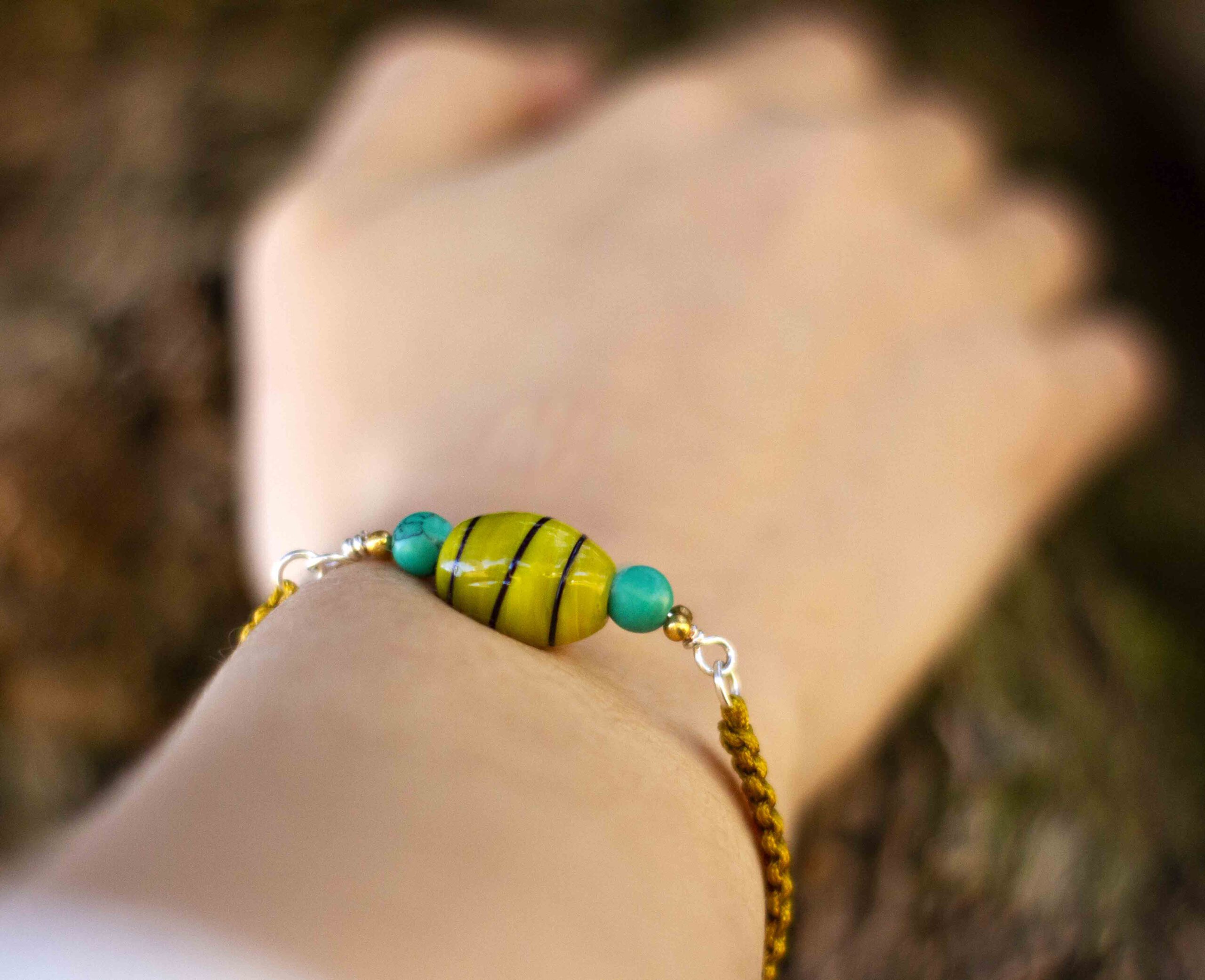 Pulsera artesanal con cuenta de cristal artesanal, adornado con piedras turquesas y cuentas metalicas, pulsera de macrame trenzado acabado en nudo ajustable para diferentes tallas de muñeca.